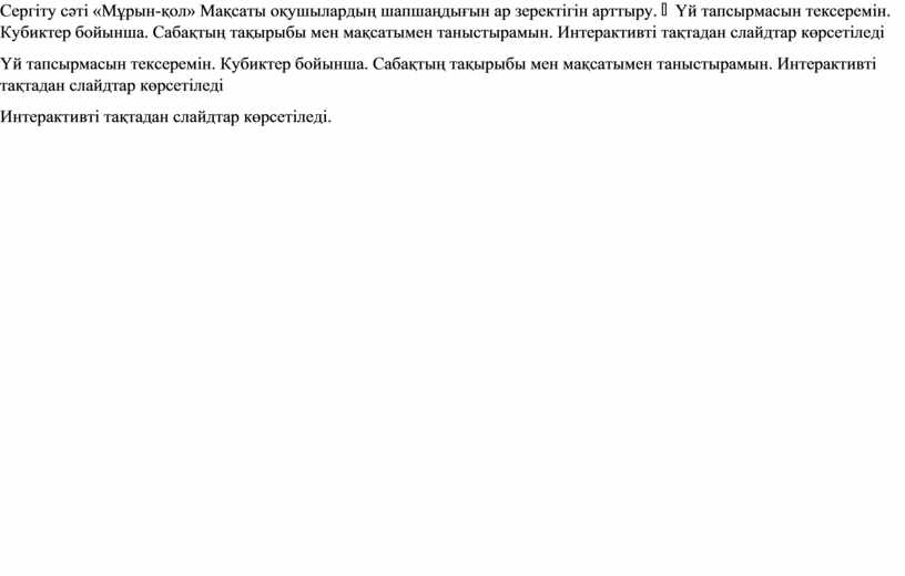 Үй тапсырмасын тексеремін. Кубиктер бойынша. Сабақтың тақырыбы мен мақсатымен таныстырамын. Интерактивті тақтадан слайдтар көрсетіледі Интерактивті тақтадан слайдтар көрсетіледі.
