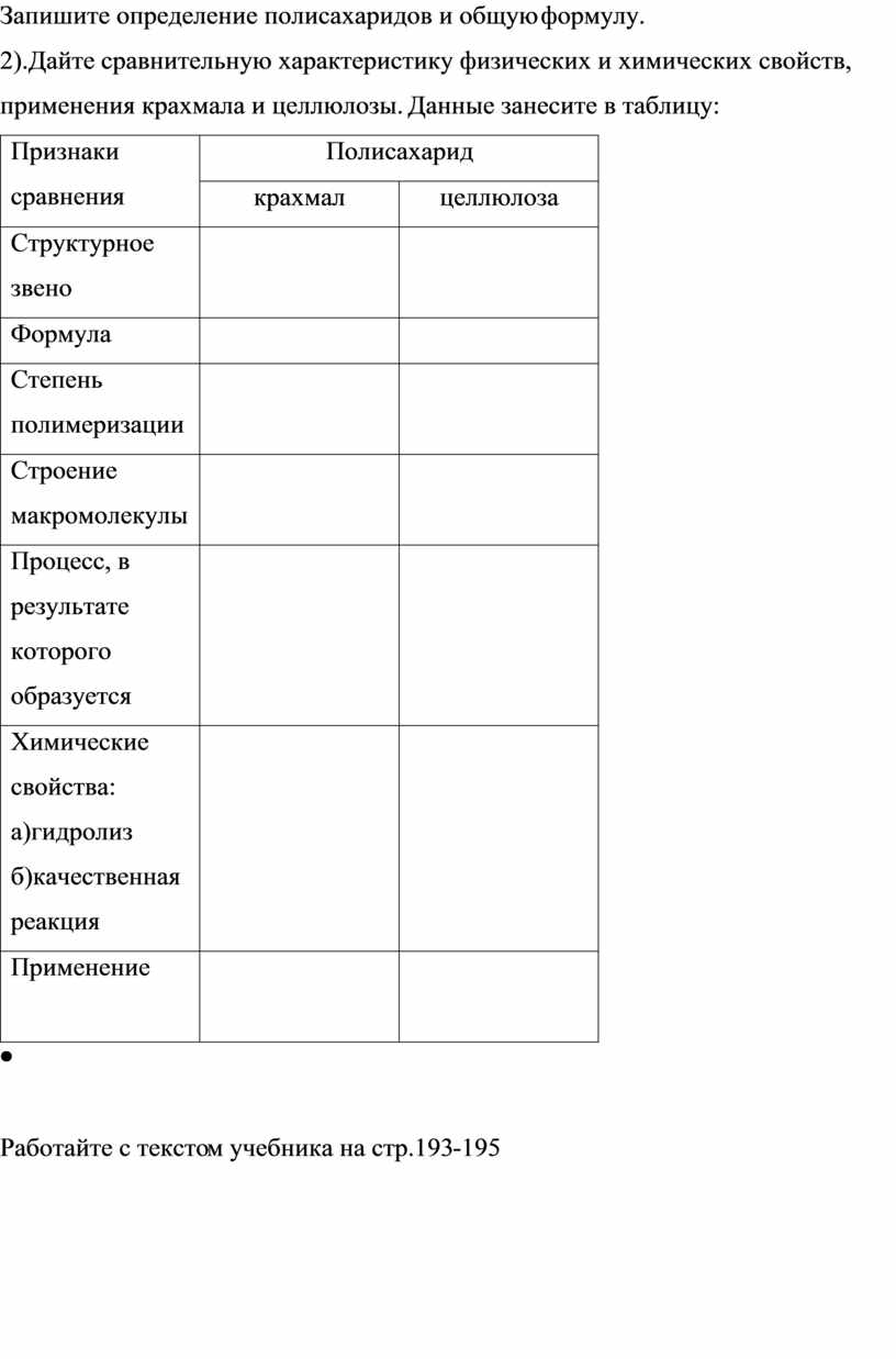 Цель: познакомиться с углеводами – полисахаридами, изучить их строение, свойства, применение. Задание: 1).Запишите определение полисахаридов и общую формулу. 2).Дайте сравнительную характеристику физических и химических свойств, применения крахмала и целлюлозы. Данные занесите в таблицу: