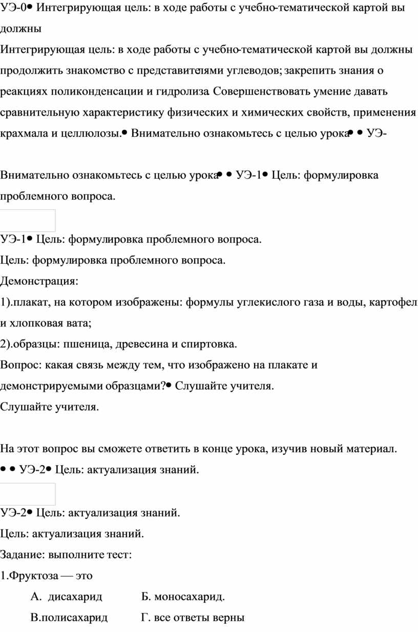 Интегрирующая цель: в ходе работы с учебно-тематической картой вы должны продолжить знакомство с представителями углеводов; закрепить знания о реакциях поликонденсации и гидролиза. Совершенствовать умение давать сравнительную характеристику физических и химических свойств, применения крахмала и целлюлозы. |