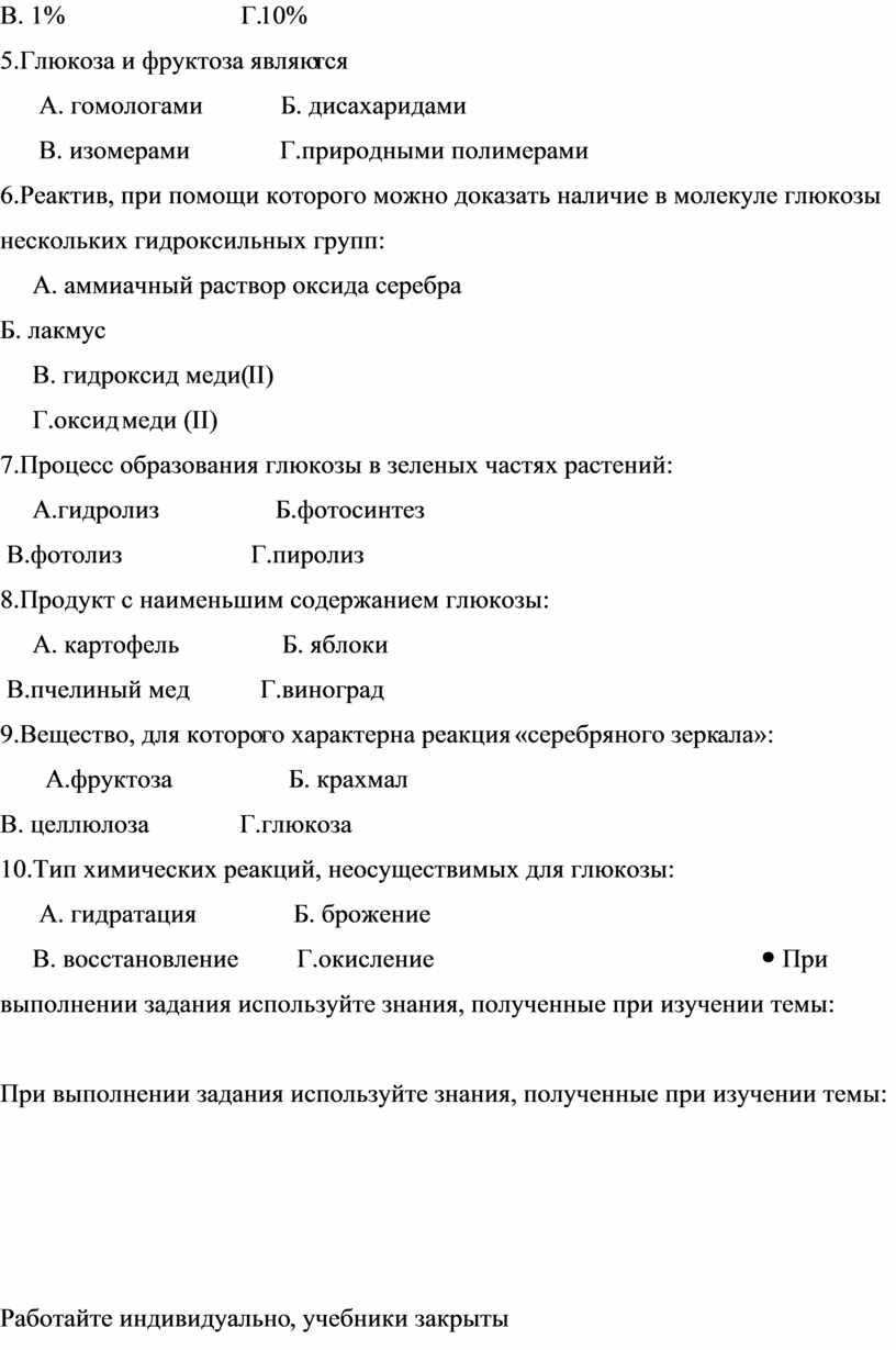 Цель: актуализация знаний. Задание: выполните тест: 1.Фруктоза — это А. дисахарид Б. моносахарид. В.полисахарид Г. все ответы верны 2.Наиболее распространенным веществом является: А. глюкоза Б крахмал. В.целлюлоза Г. гликоген 3.Углевод, тривиальное название которого «виноградный сахар»: А. глюкоза Б. лактоза В.мальтоза. Г.фруктоза 4.Массовая доля глюкозы в крови человека А. 0,01% Б. 0,1% В. 1% Г.10% 5.Глюкоза и фруктоза являются А. гомологами Б. дисахаридами В. изомерами Г.природными полимерами 6.Реактив, при помощи которого можно доказать наличие в молекуле глюкозы нескольких гидроксильных групп: А. аммиачный раствор оксида серебра Б. лакмус В. гидроксид меди(II) Г.оксид меди (II) 7.Процесс образования глюкозы в зеленых частях растений: А.гидролиз Б.фотосинтез В.фотолиз Г.пиролиз 8.Продукт с наименьшим содержанием глюкозы: А. картофель Б. яблоки В.пчелиный мед Г.виноград 9.Вещество, для которого характерна реакция «серебряного зеркала»: А.фруктоза Б. крахмал В. целлюлоза Г.глюкоза 10.Тип химических реакций, неосуществимых для глюкозы: А. гидратация Б. брожение В. восстановление Г.окисление |