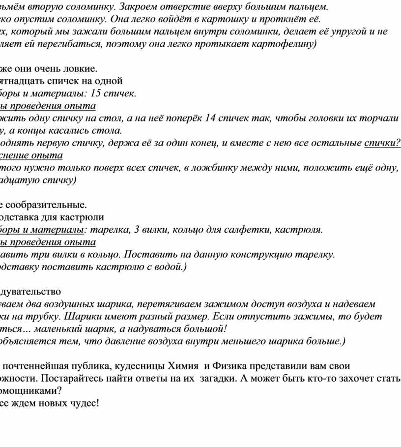 Итак, почтеннейшая публика, кудесницы Химия и Физика представили вам свои возможности. Постарайтесь найти ответы на их загадки. А может быть кто-то захочет стать их помощниками?