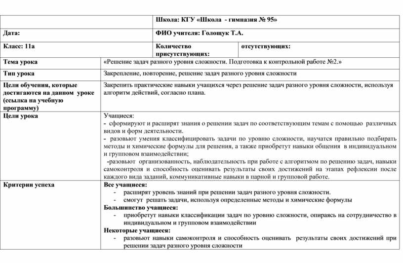 Все учащиеся: - расширят уровень знаний при решении задач разного уровня сложности. - смогут решать задачи, используя определенные методы и химические формулы Большинство учащиеся: - приобретут навыки классификации задач по уровню сложности, опираясь на сотрудничество в индивидуальном и групповом взаимодействии Некоторые учащиеся: - разовьют навыки самоконтроля и способность оценивать результаты своих достижений при решении задач разного уровня сложности |