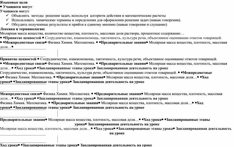 Учащиеся могут: ü Объяснить методы решения задач, используя алгоритм действия и математические расчеты ü Использовать химические термины и определения для оформления решения задач (навык говорения). ü Обсудить полученные результаты и прийти к единому мнению (навык говорения и слушание) Лексика и терминология: Молярная масса вещества, количество вещества, плотность, массовая доля раствора, процентное содержание…