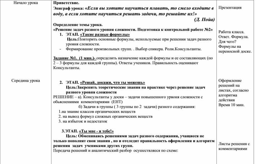 Приветствие. Эпиграф урока: «Если вы хотите научиться плавать, то смело входите в воду, а если хотите научиться решать задачи, то решайте их!» (Д. Пойа) Определение темы урока. «Решение задач разного уровня сложности. Подготовка к контрольной работе №2» 1. ЭТАП. «Такие разные формулы» Цель:Повторить основные формулы, используемые при решении задач разного уровня сложности. - Формирование произвольных групп. . Выбор спикера. Роли.Консультанты. Задание №1. (1 мин.)- определить назначение каждой формулы и ее составляющих (по 2 – 3 формулы для каждой группы). Ответы учеников. Правильность оценивают Консультанты.