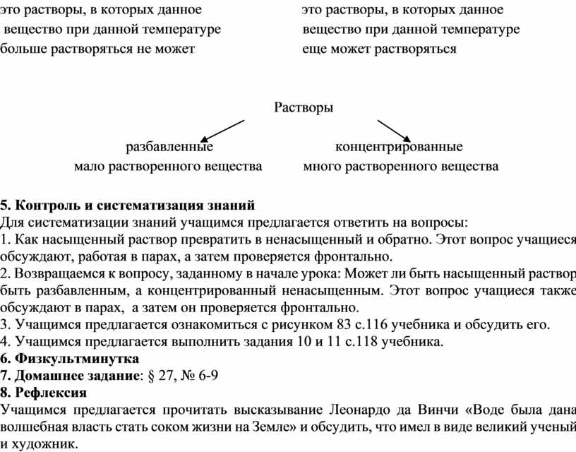 1. Как насыщенный раствор превратить в ненасыщенный и обратно. Этот вопрос учащиеся обсуждают, работая в парах, а затем проверяется фронтально.