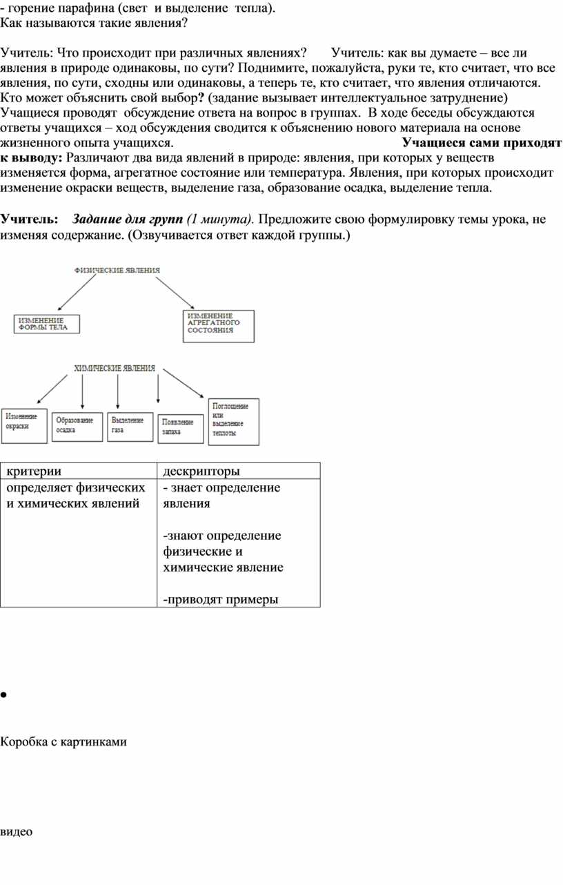 Учитель: Что происходит при различных явлениях? Учитель: как вы думаете – все ли явления в природе одинаковы, по сути? Поднимите, пожалуйста, руки те, кто считает, что все явления, по сути, сходны или одинаковы, а теперь те, кто считает, что явления отличаются. Кто может объяснить свой выбор? (задание вызывает интеллектуальное затруднение) Учащиеся проводят обсуждение ответа на вопрос в группах. В ходе беседы обсуждаются ответы учащихся – ход обсуждения сводится к объяснению нового материала на основе жизненного опыта учащихся. Учащиеся сами приходят к выводу: Различают два вида явлений в природе: явления, при которых у веществ изменяется форма, агрегатное состояние или температура. Явления, при которых происходит изменение окраски веществ, выделение газа, образование осадка, выделение тепла. Учитель: Задание для групп (1 минута). Предложите свою формулировку темы урока, не изменяя содержание. (Озвучивается ответ каждой группы.)