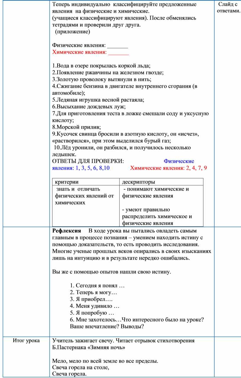 Теперь индивидуально классифицируйте предложенные явления на физические и химические. (учащиеся классифицируют явления). После обменялись тетрадями и проверили друг друга. (приложение)
