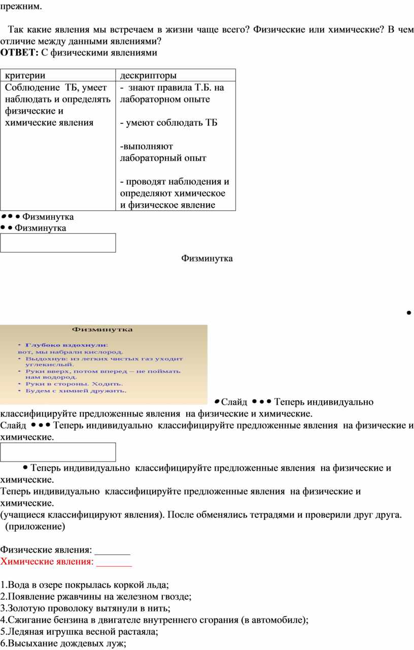 Учащийся дают определение физических и химических явлений Учащийся знают ТБ, умеет наблюдать и определять физические и химические явления Учащийся знает и отличает физических явлений от химических |