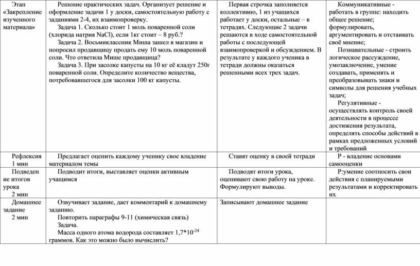 Предметные: установить взаимосвязь понятий: масса, количество вещества, молярная масса число Авогадро. Личностные: формировать умения понимать значимость естественнонаучных, математических знаний для решения практических задач; устанавливать связь между целью деятельности и ее результатом, оценивать собственный вклад в работу группы; Метапредметные: выбор, принятие и сохранение учебной цели и задачи, умение структурировать знания, умение строить речевое высказывание. |