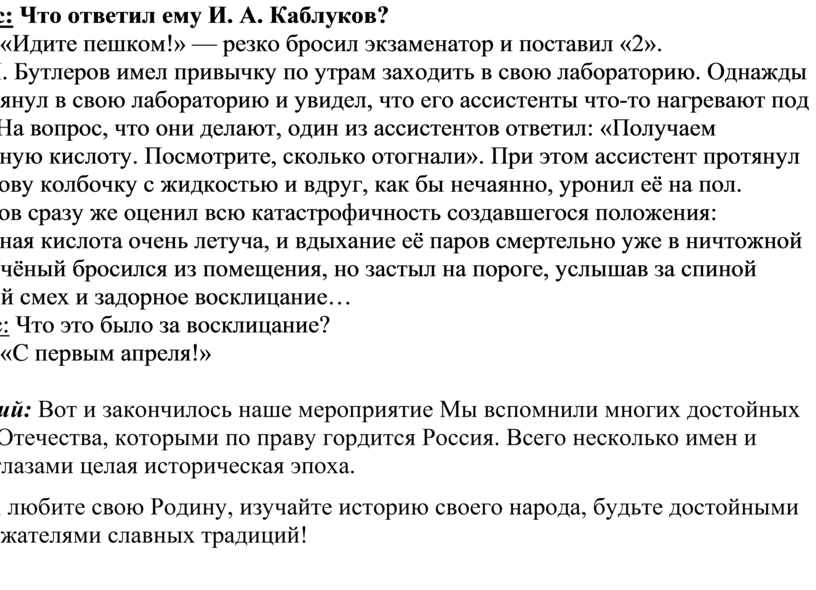 2. И. А. Каблуков очень строго относился к своим студентам, требуя от них только хорошие знания химии. Правда, в отдельные минуты профессор позволял себе пошутить. Однажды. Во время экзамена Каблуков обнаружил у одного из студентов слабое знание материала. Он нахмурился и поинтересовался: «На троечке хотели прокатиться, молодой человек?»