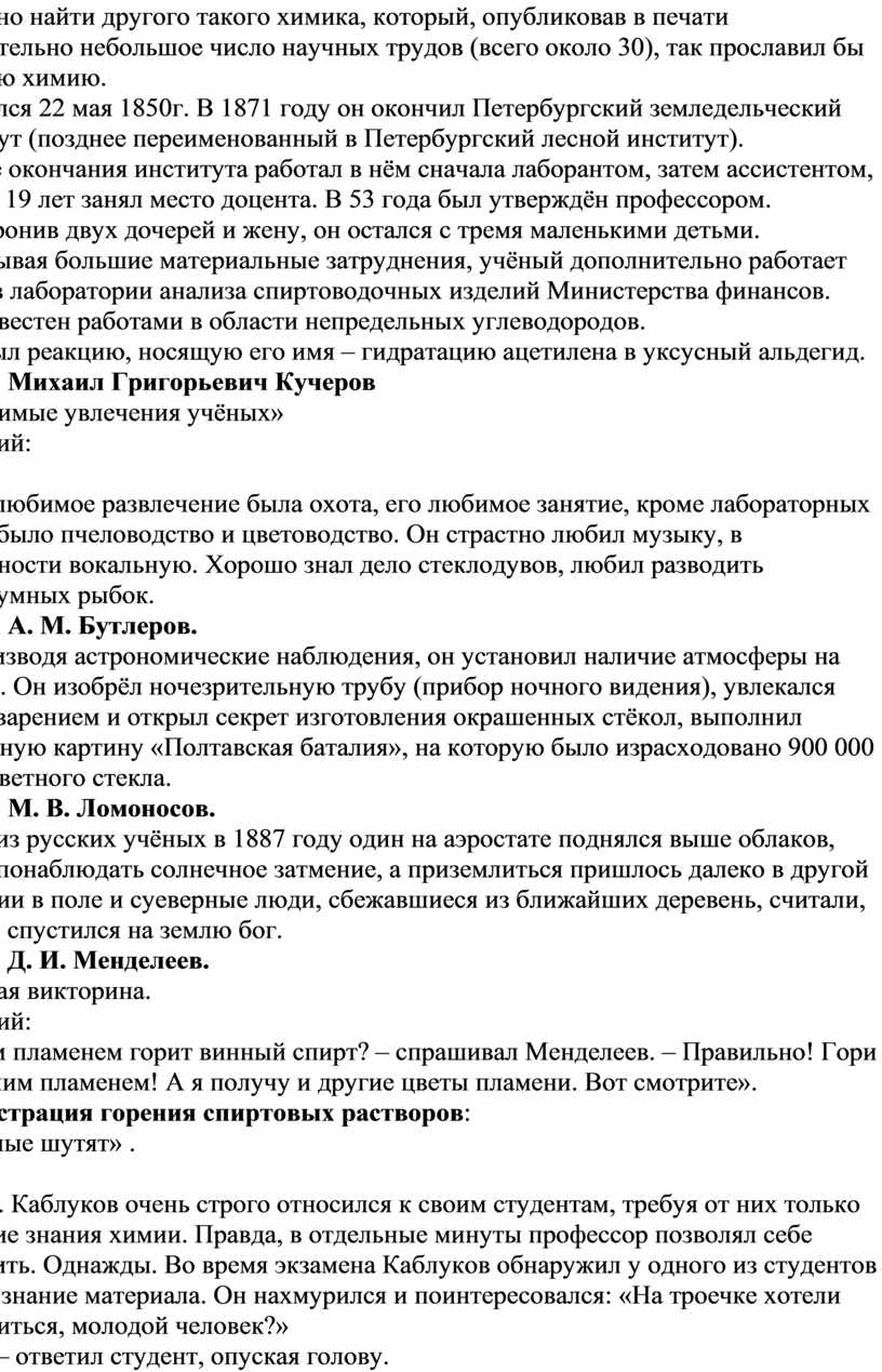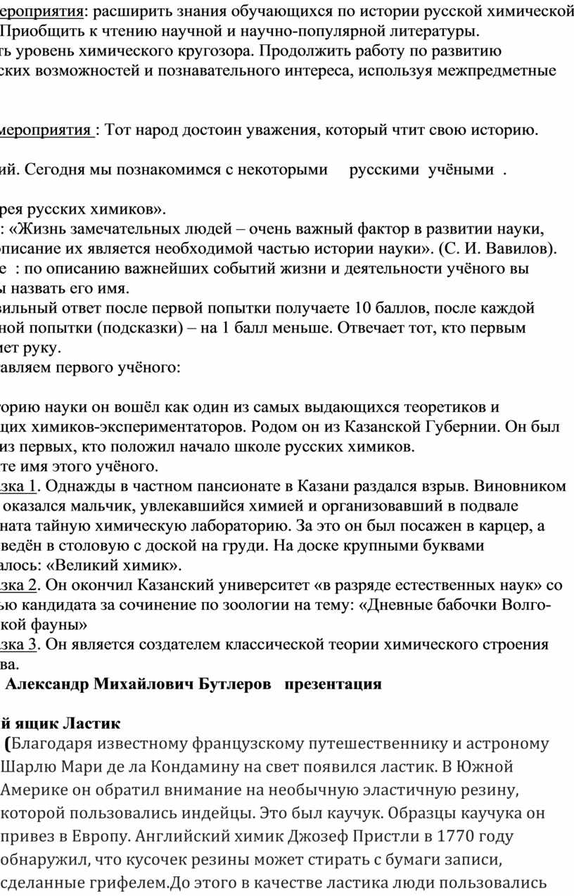 Цель мероприятия: расширить знания обучающихся по истории русской химической науки. Приобщить к чтению научной и научно-популярной литературы.