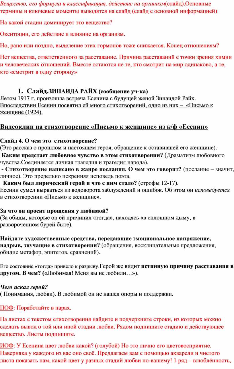 На листах с текстом стихотворения найдите и подчеркните строки, из которых можно сделать вывод о той или иной стадии любви. Рядом подпишите стадию и действующее вещество. Листы подпишите.