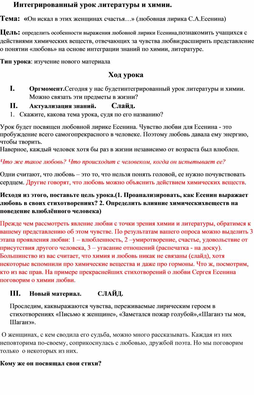 Цель: определить особенности выражения любовной лирики Есенина,познакомить учащихся с действиями химических веществ, отвечающих за чувства любви;расширить представление о понятии «любовь» на основе интеграции знаний по химии, литературе.