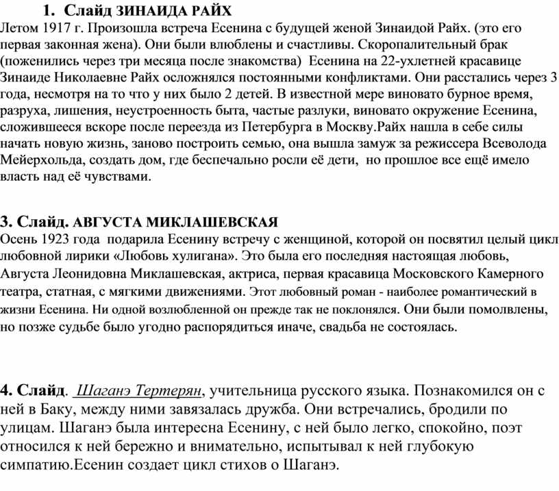 Летом 1917 г. Произошла встреча Есенина с будущей женой Зинаидой Райх. (это его первая законная жена). Они были влюблены и счастливы. Скоропалительный брак (поженились через три месяца после знакомства) Есенина на 22-ухлетней красавице Зинаиде Николаевне Райх осложнялся постоянными конфликтами. Они расстались через 3 года, несмотря на то что у них было 2 детей. В известной мере виновато бурное время, разруха, лишения, неустроенность быта, частые разлуки, виновато окружение Есенина, сложившееся вскоре после переезда из Петербурга в Москву.Райх нашла в себе силы начать новую жизнь, заново построить семью, она вышла замуж за режиссера Всеволода Мейерхольда, создать дом, где беспечально росли её дети, но прошлое все ещё имело власть над её чувствами.