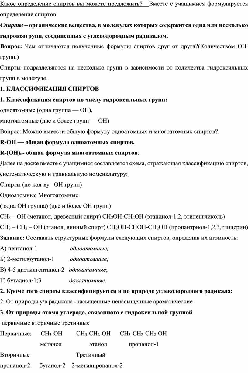 Какое определение спиртов вы можете предложить? Вместе с учащимися формулируется определение спиртов: