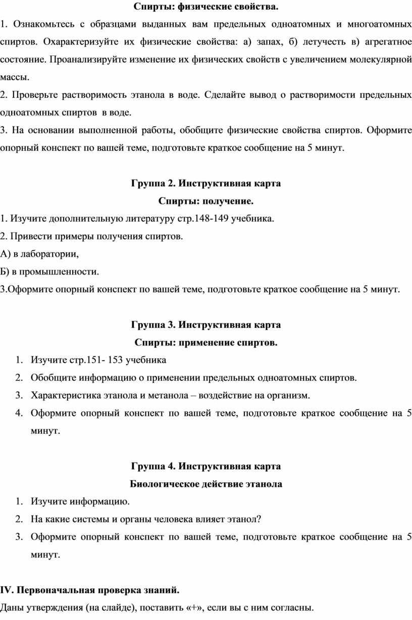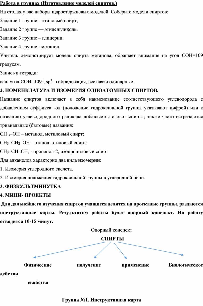 Для дальнейшего изучения спиртов учащиеся делятся на проектные группы, раздаются инструктивные карты. Результатом работы будет опорный конспект. На работу отводится 10-15 минут.