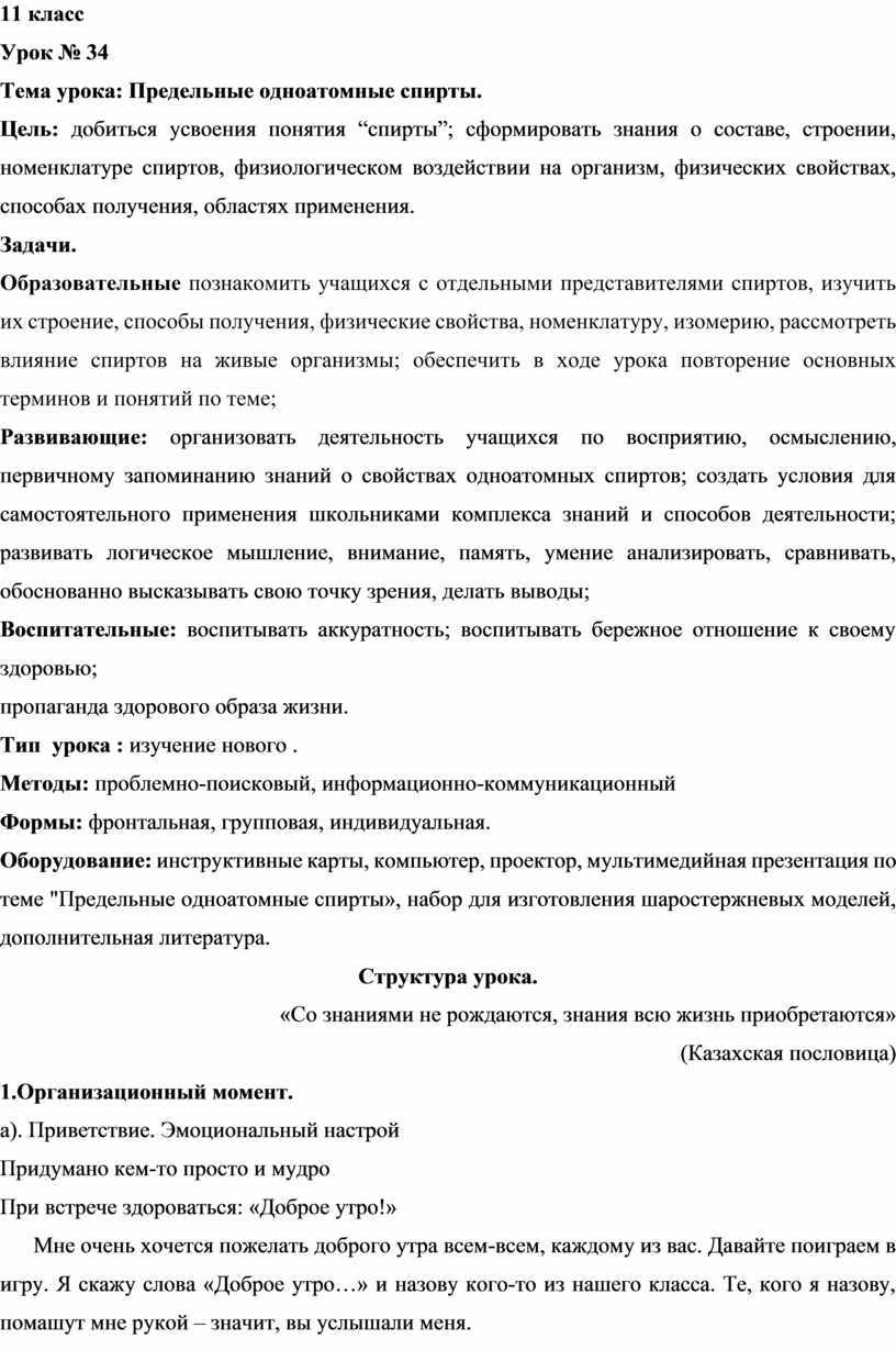 Оборудование: инструктивные карты, компьютер, проектор, мультимедийная презентация по теме "Предельные одноатомные спирты», набор для изготовления шаростержневых моделей, дополнительная литература.