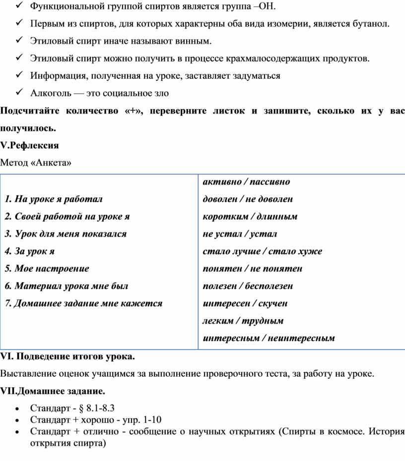 Цель: добиться усвоения понятия “спирты”; сформировать знания о составе, строении, номенклатуре спиртов, физиологическом воздействии на организм, физических свойствах, способах получения, областях применения.