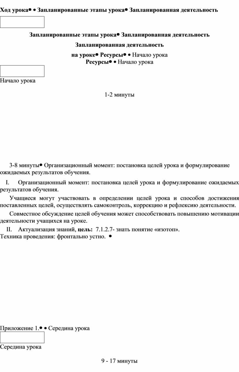 I. Организационный момент: постановка целей урока и формулирование ожидаемых результатов обучения. Учащиеся могут участвовать в определении целей урока и способов достижения поставленных целей, осуществлять самоконтроль, коррекцию и рефлексию деятельности. Совместное обсуждение целей обучения может способствовать повышению мотивации деятельности учащихся на уроке. II. Актуализация знаний, цель: 7.1.2.7- знать понятие «изотоп». Техника проведения: фронтально устно. |