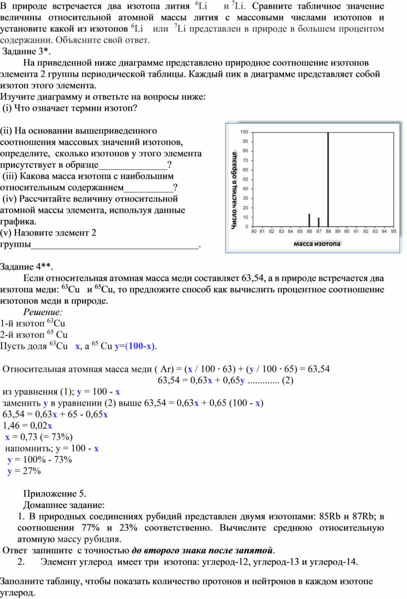 ii. Учитель корректирует ответы учащихся и вводит понятие «относительная атомная масса» и способ её расчета. Относительная атомная масса химического элемента рассчитывается как средняя масса изотопов химического элемента с учётом их распространённости в природе.