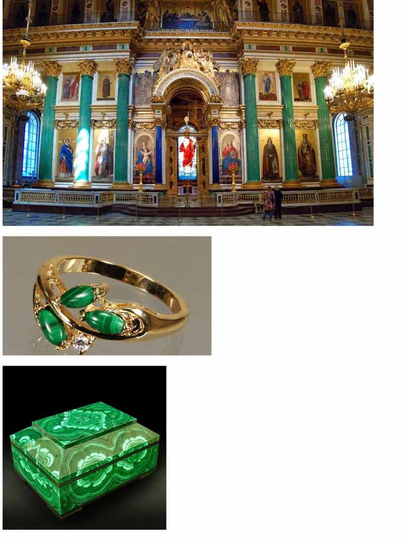 Особенно ценится малахит из медных месторождений на Урале близ Екатеринбурга - именно здесь добывался малахит для облицовки каминов, столешниц, пилястров и ваз Малахитового зала Зимнего дворца. В Малахитовом зале Эрмитажа хранится более 200 изделий из малахита. Колонны из малахита установлены в алтарной части Исаакиевского собора в Санкт-Петербурге.