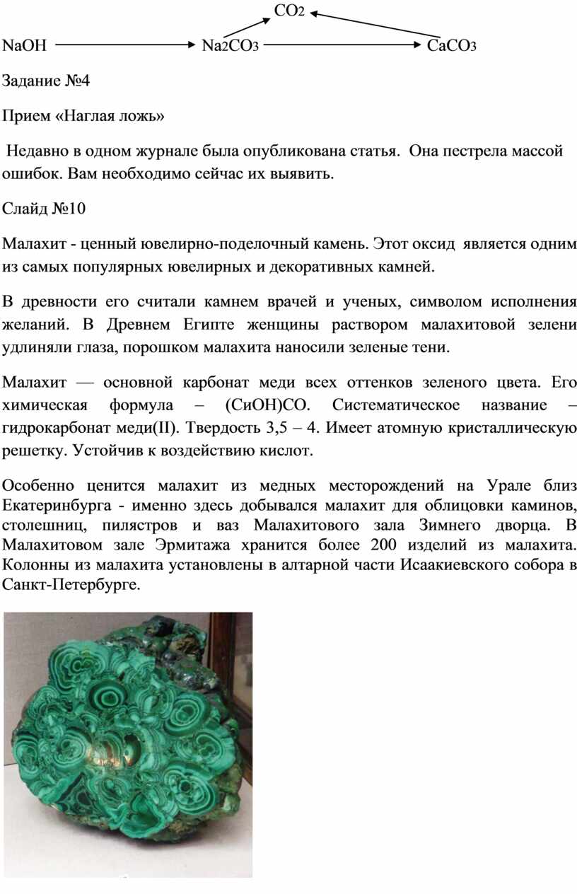 Малахит — основной карбонат меди всех оттенков зеленого цвета. Его химическая формула – (СиОН)СО. Систематическое название – гидрокарбонат меди(II). Твердость 3,5 – 4. Имеет атомную кристаллическую решетку. Устойчив к воздействию кислот.