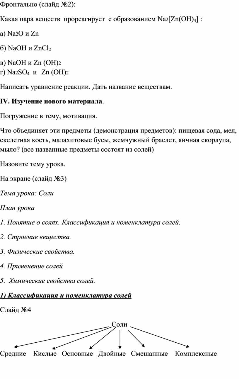 Соли. Классификация, номенклатура. Свойства солей.