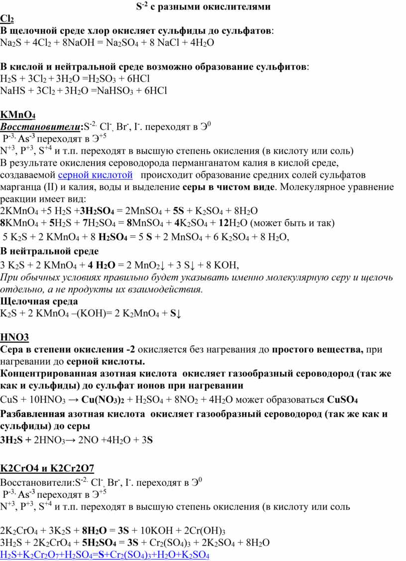 S-2 c разными окислителями