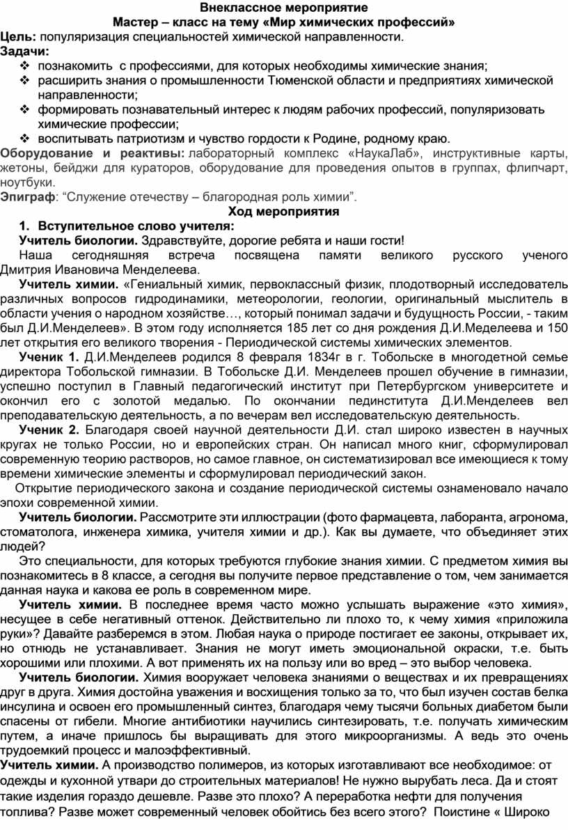 Учитель химии. «Гениальный химик, первоклассный физик, плодотворный исследователь различных вопросов гидродинамики, метеорологии, геологии, оригинальный мыслитель в области учения о народном хозяйстве…, который понимал задачи и будущность России, - таким был Д.И.Менделеев». В этом году исполняется 185 лет со дня рождения Д.И.Меделеева и 150 лет открытия его великого творения - Периодической системы химических элементов.