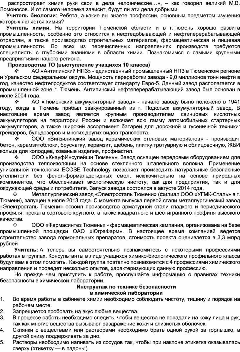 Учитель химии. На территории Тюменской области и в г.Тюмень хорошо развита промышленность, особенно это относится к нефтедобывающей и нефтеперерабатывающей отраслям, а также производство строительных материалов, фармацевтическая и пищевая промышленности. Во всех из перечисленных направлениях производств требуются специалисты с глубокими знаниями в области химии. Познакомимся с самыми крупными предприятиями нашего региона.