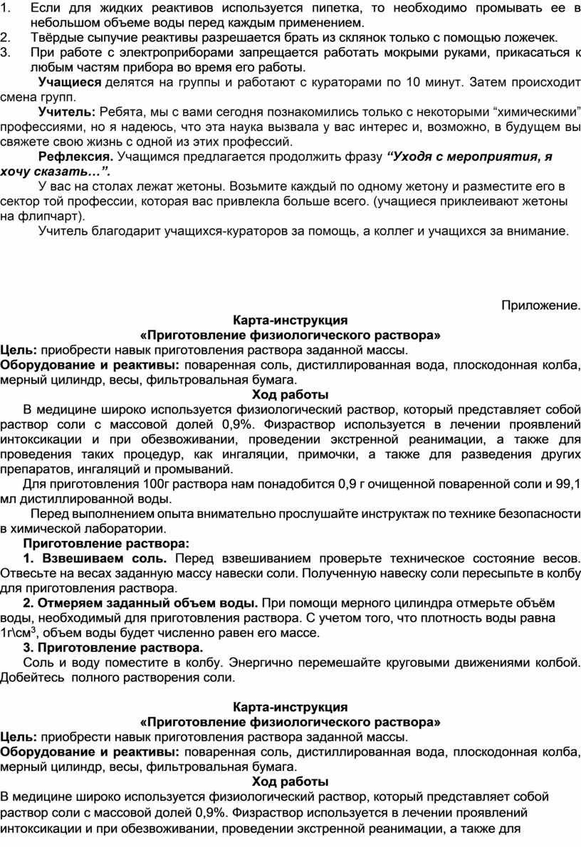 Для приготовления 100г раствора нам понадобится 0,9 г очищенной поваренной соли и 99,1 мл дистиллированной воды.