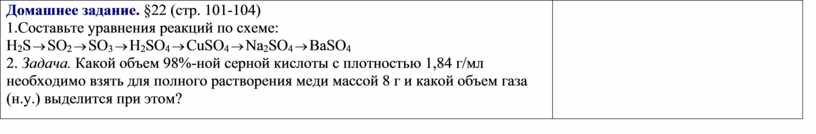 Домашнее задание. §22 (стр. 101-104) 1.Составьте уравнения реакций по схеме: Н2S 2. Задача. Какой объем 98%-ной серной кислоты с плотностью 1,84 г/мл необходимо взять для полного растворения меди массой 8 г и какой объем газа (н.у.) выделится при этом? |
