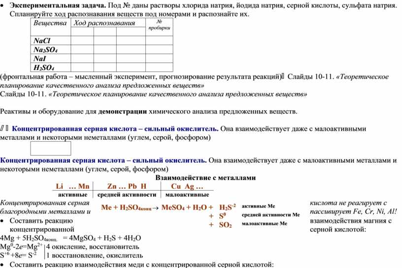 Концентрированная серная кислота не реагирует с благородными металлами и пассивирует Fe, Cr, Ni, Al! · Составить реакцию взаимодействия магния с концентрированной серной кислотой: 4Мg + 5H2SO4конц. = 4MgSO4 + H2S + 4H2O