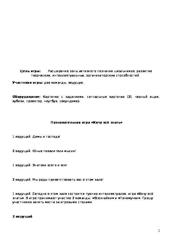 1 ведущий: Сегодня в этом зале состоится турнир интеллектуалов, игра «Хочу всё