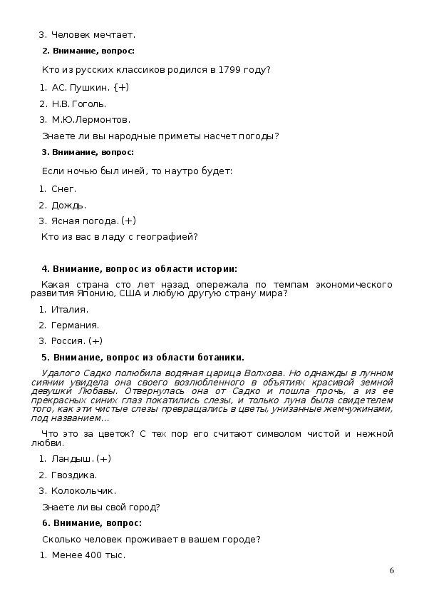 номер, то вопрос задается следующий. Например: выпал 5, задается 6 вопрос, выпал