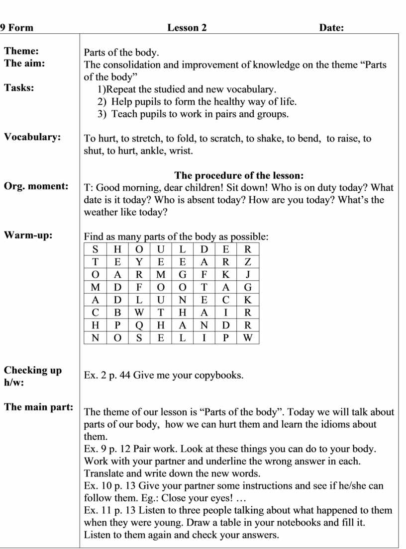 The theme of our lesson is “Parts of the body”. Today we will talk about parts of our body, how we can hurt them and learn the idioms about them. Ex. 9 p. 12 Pair work. Look at these things you can do to your body. Work with your partner and underline the wrong answer in each. Translate and write down the new words. Ex. 10 p. 13 Give your partner some instructions and see if he/she can follow them. Eg.: Close your eyes! … Ex. 11 p. 13 Listen to three people talking about what happened to them when they were young. Draw a table in your notebooks and fill it. Listen to them again and check your answers. Ex. 13 p. 13 Group work. Divide into groups of 4. Tell the partners in your group about a part of your body, what happened to it and what the result was. Fill in the table as in ex. 11. Ex. 14 p. 13 Fill in the gaps in the following idioms with a suitable part of the body. Use the words in the box.