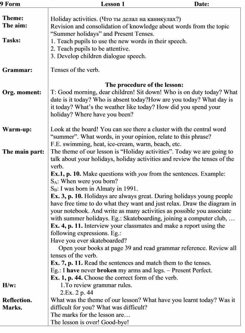 Look at the board! You can see there a cluster with the central word “summer”. What words, in your opinion, relate to this phrase? F.E. swimming, heat, ice-cream, warm, beach, etc. The theme of our lesson is “Holiday activities”. Today we are going to talk about your holidays, holiday activities and review the tenses of the verb. Ex.1, p. 10. Make questions with you from the sentences. Example: SA: When were you born? SB: I was born in Almaty in 1991. Ex. 3, p. 10. Holidays are always great. During holidays young people have free time to do what they want and just relax. Draw the diagram in your notebook. And write as many activities as possible you associate with summer holidays. Eg.: Skateboarding, joining a computer club, … Ex. 4, p. 11. Interview your classmates and make a report using the following expressions. Eg.: Have you ever skateboarded? Open your books at page 39 and read grammar reference. Review all tenses of the verb. Ex. 7, p. 11. Read the sentences and match them to the tenses. Eg.: I have never broken my arms and legs. – Present Perfect. Ex. 1, p. 44. Choose the correct form of the verb. 1.To review grammar rules. 2.Ex. 2 p. 44 What was the theme of our lesson? What have you learnt today? Was it difficult for you? What was difficult? The marks for the lesson are… The lesson is over! Good-bye! |