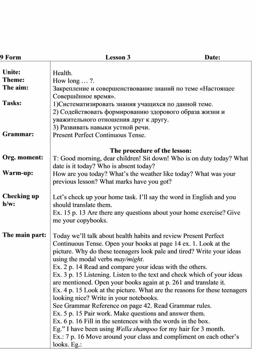 Today we’ll talk about health habits and review Present Perfect Continuous Tense. Open your books at page 14 ex. 1. Look at the picture. Why do these teenagers look pale and tired? Write your ideas using the modal verbs may/might. Ex. 2 p. 14 Read and compare your ideas with the others. Ex. 3 p. 15 Listening. Listen to the text and check which of your ideas are mentioned. Open your books again at p. 261 and translate it. Ex. 4 p. 15 Look at the picture. What are the reasons for these teenagers looking nice? Write in your notebooks. See Grammar Reference on page 42. Read Grammar rules. Ex. 5 p. 15 Pair work. Make questions and answer them. Ex. 6 p. 16 Fill in the sentences with the words in the box. Eg.” I have been using Wella shampoo for my hair for 3 month. Ex.: 7 p. 16 Move around your class and compliment on each other’s looks. Eg.: S1: You look slim. S2: Thanks. It is because I’ve been doing regular exercises. Ex. 8 p. 17 Read and translate the text about famous company in GB. Write out the sentences in Present Perfect Tense. Ex. 9, 10 p. 17 Pair work. Here you can see the short answers of the owner of the company to a journalist. Write the interviewer’s questions and the owner’s full answers. Make up a dialogue . Eg.: How long have you been selling perfumes and soap? We have been selling these products since 1976.