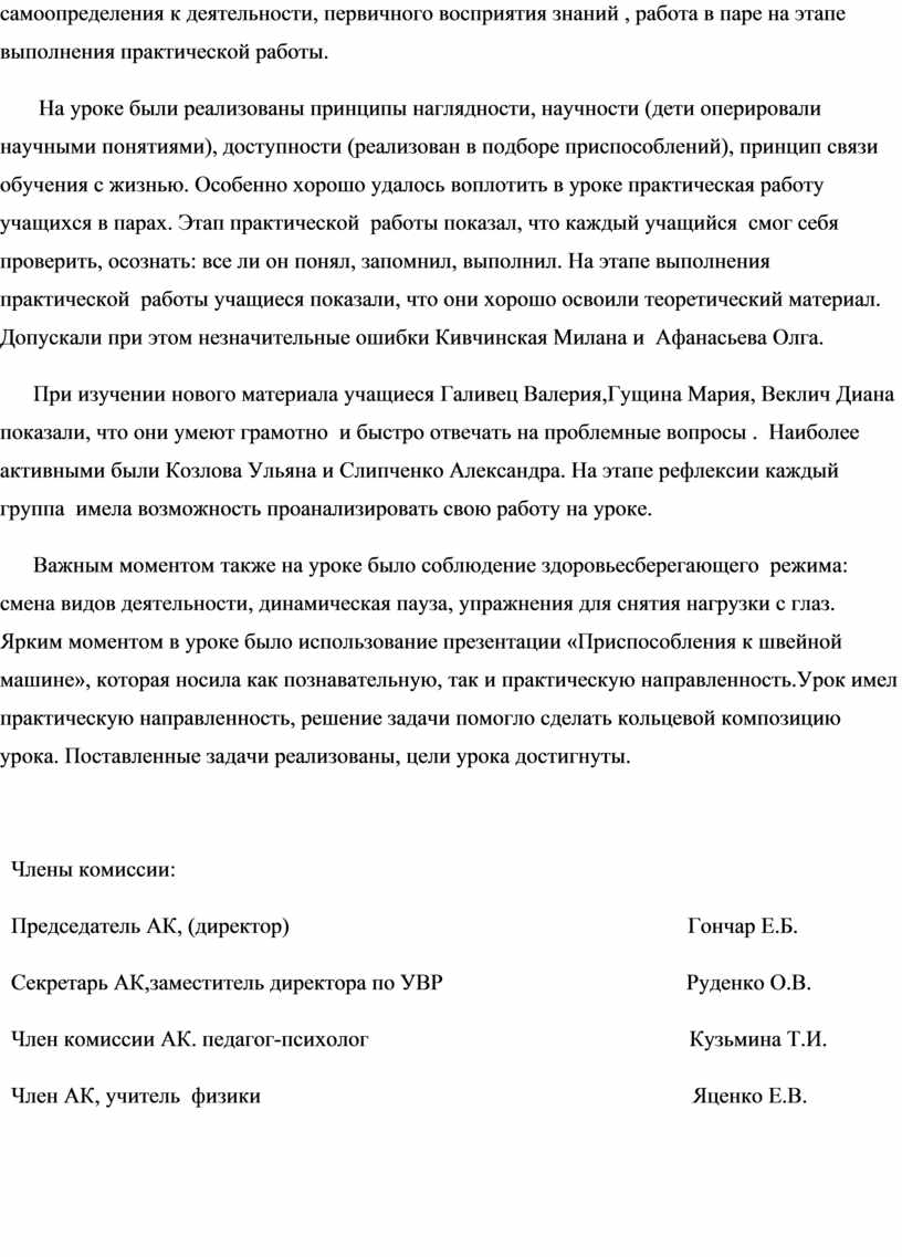 Члены комиссии: Председатель АК, (директор) Гончар Е.Б. Секретарь АК,заместитель директора по УВР Руденко О.В. Член комиссии АК. педагог-психолог Кузьмина Т.И. Член АК, учитель физики Яценко Е.В.