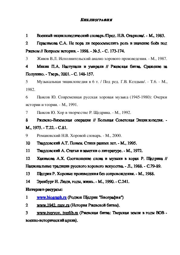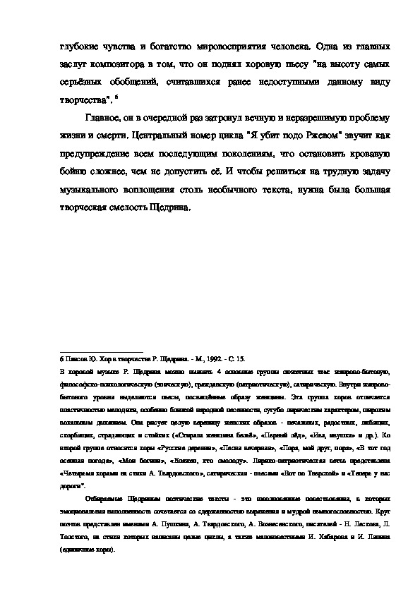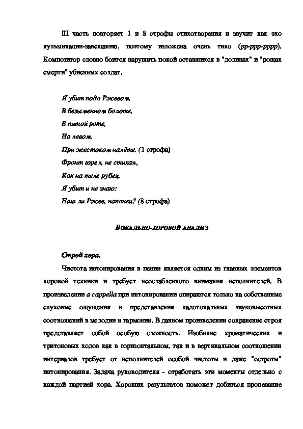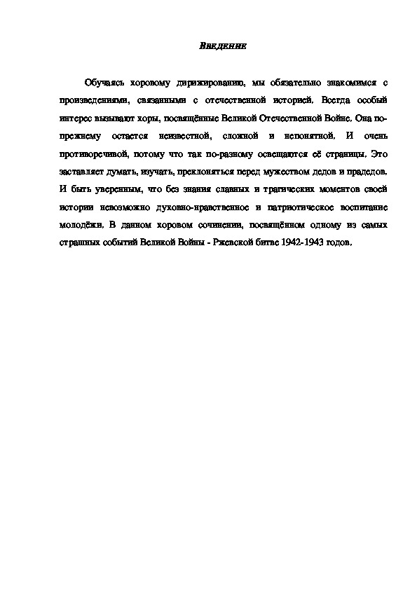 Обучаясь хоровому дирижированию, мы обязательно знакомимся с произведениями, связанными с отечественной историей. Всегда особый интерес вызывают хоры, посвящённые Великой Отечественной Войне. Она по-прежнему остается неизвестной, сложной и непонятной. И очень противоречивой, потому что так по-разному освещаются её страницы. Это заставляет думать, изучать, преклоняться перед мужеством дедов и прадедов. И быть уверенным, что без знания славных и трагических моментов своей истории невозможно духовно-нравственное и патриотическое воспитание молодёжи. В данном хоровом сочинении, посвящённом одному из самых страшных событий Великой Войны - Ржевской битве 1942-1943 годов.Хоровая пьеса Р. Щедрина "Я убит подо Ржевом"