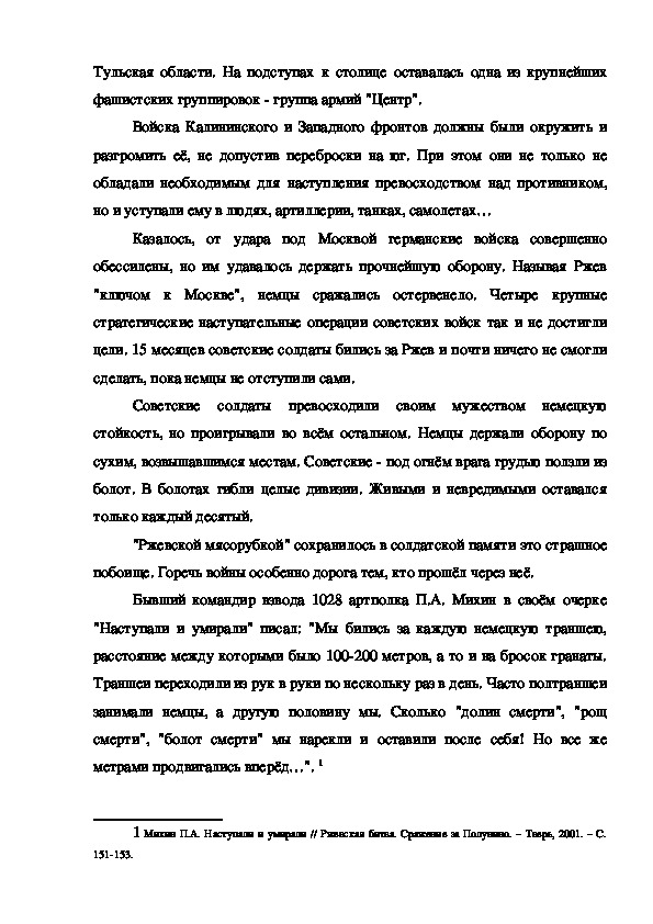 1 Михин П.А. Наступали и умирали // Ржевская битва. Сражение за Полунино. – Тверь, 2001. – С.
