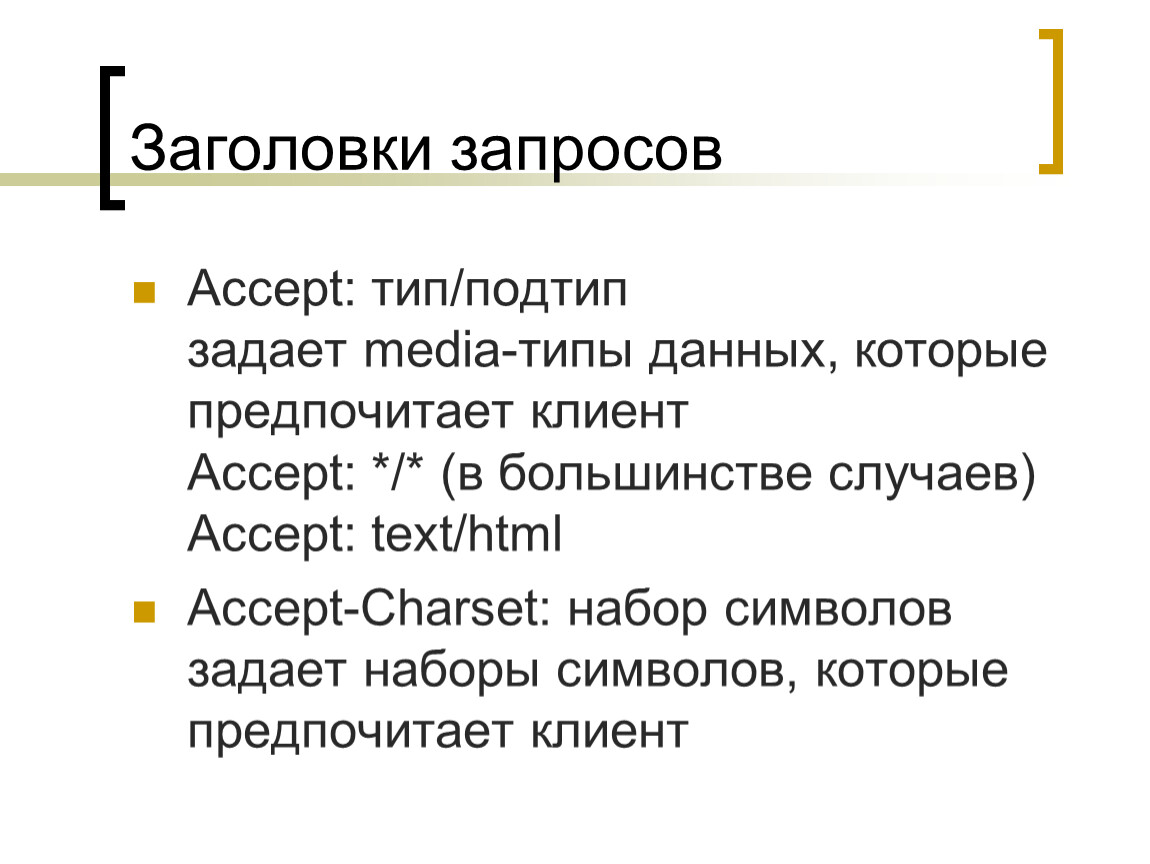 Accept: тип/подтипзадает media-типы данных, которые предпочитает клиентAccept: */* (в большинстве случаев)Accept: text/html