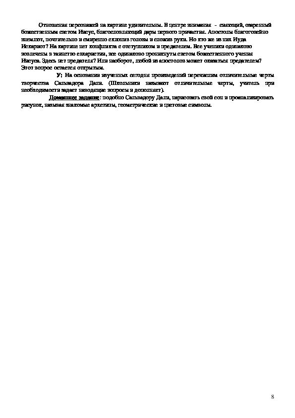 Цель урока: дать учащимся представление о творчестве С. Дали в контексте художественной культуры ХХ века.