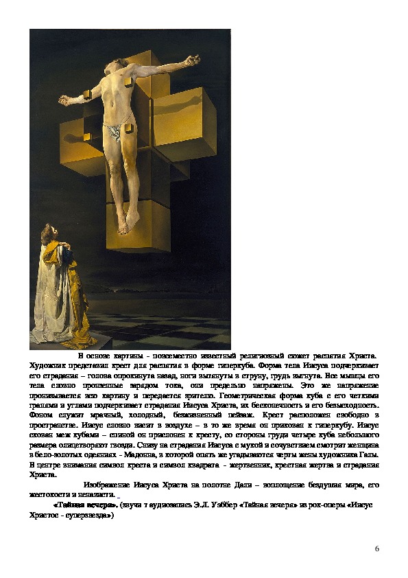 Художник представил крест для распятия в форме гиперкуба. Форма тела Иисуса подчеркивает