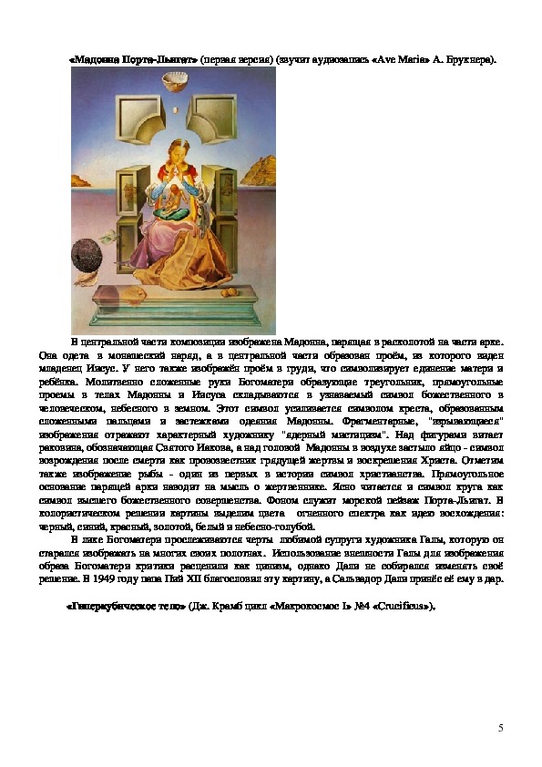 получает репродукцию одной картины: «Мадонна ПортаЛьигат», «Гиперкубическое тело»,