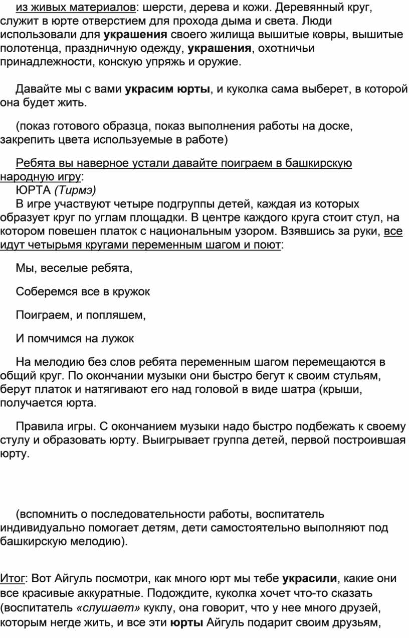 Оборудование: кукла в национальном башкирском костюме, картинка с изображением юрты внутри и снаружи, 2 платка, готовый образец (большой по размеру, башкирская народная мелодия; клей, кисточки, подставки, салфетки, вырезанные из цветной бумаги фигурки для украшения юрт (для каждого ребенка)
