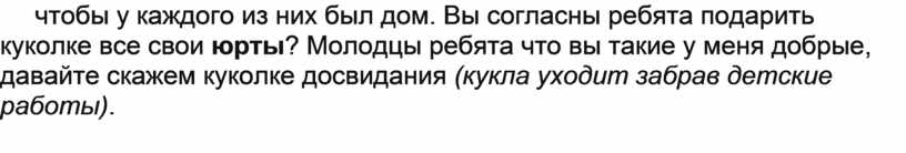 Итог: Вот Айгуль посмотри, как много юрт мы тебе украсили, какие они все красивые аккуратные. Подождите, куколка хочет что-то сказать (воспитатель «слушает» куклу, она говорит, что у нее много друзей, которым негде жить, и все эти юрты Айгуль подарит своим друзьям, чтобы у каждого из них был дом. Вы согласны ребята подарить куколке все свои юрты? Молодцы ребята что вы такие у меня добрые, давайте скажем куколке досвидания (кукла уходит забрав детские работы).