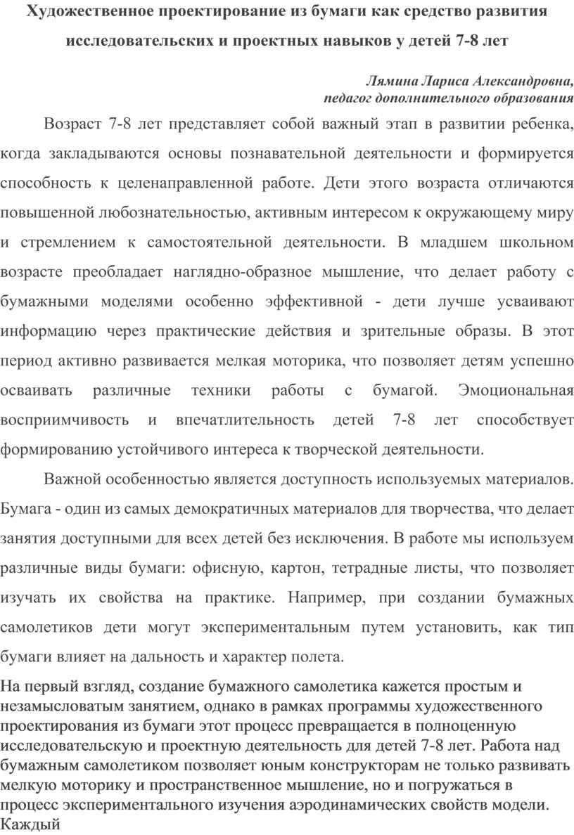 Художественное проектирование из бумаги как средство развития исследовательских и проектных навыков у детей 7-8 лет