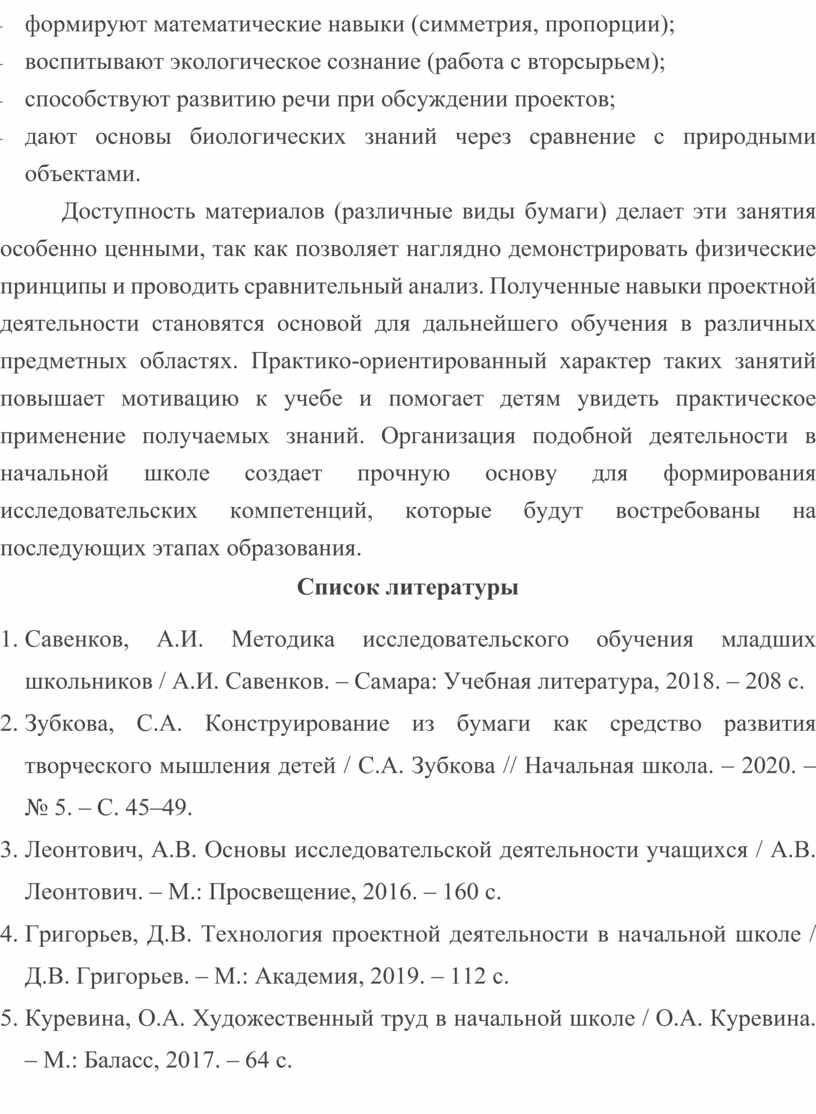 Доступность материалов (различные виды бумаги) делает эти занятия особенно ценными, так как позволяет наглядно демонстрировать физические принципы и проводить сравнительный анализ. Полученные навыки проектной деятельности становятся основой для дальнейшего обучения в различных предметных областях. Практико-ориентированный характер таких занятий повышает мотивацию к учебе и помогает детям увидеть практическое применение получаемых знаний. Организация подобной деятельности в начальной школе создает прочную основу для формирования исследовательских компетенций, которые будут востребованы на последующих этапах образования.