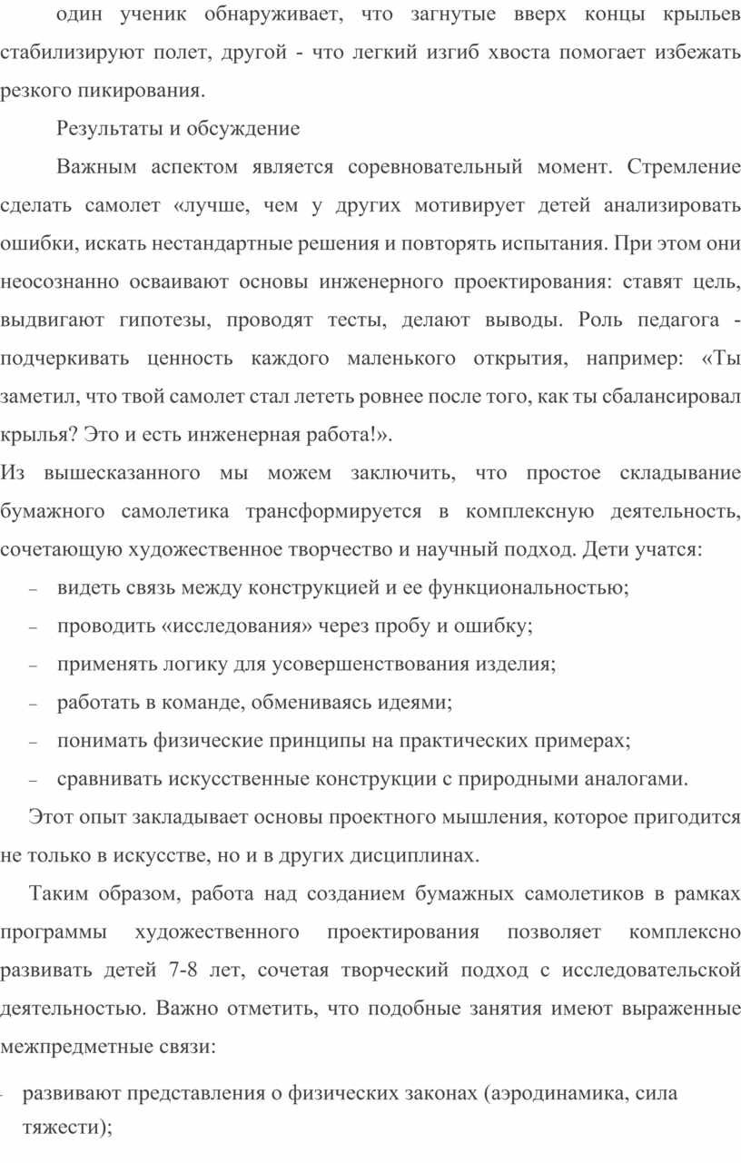 Таким образом, работа над созданием бумажных самолетиков в рамках программы художественного проектирования позволяет комплексно развивать детей 7-8 лет, сочетая творческий подход с исследовательской деятельностью. Важно отметить, что подобные занятия имеют выраженные межпредметные связи:
